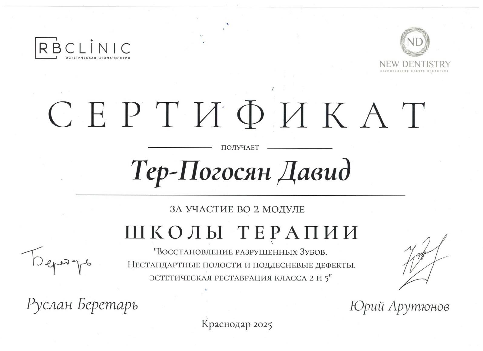 В работе сочетает высокую клиническую точность, организованность процесса и строгое соблюдение современных стоматологических протоколов. Его практика направлена на терапевтическое лечение зубов с акцентом на качество и прогнозируемый результат.